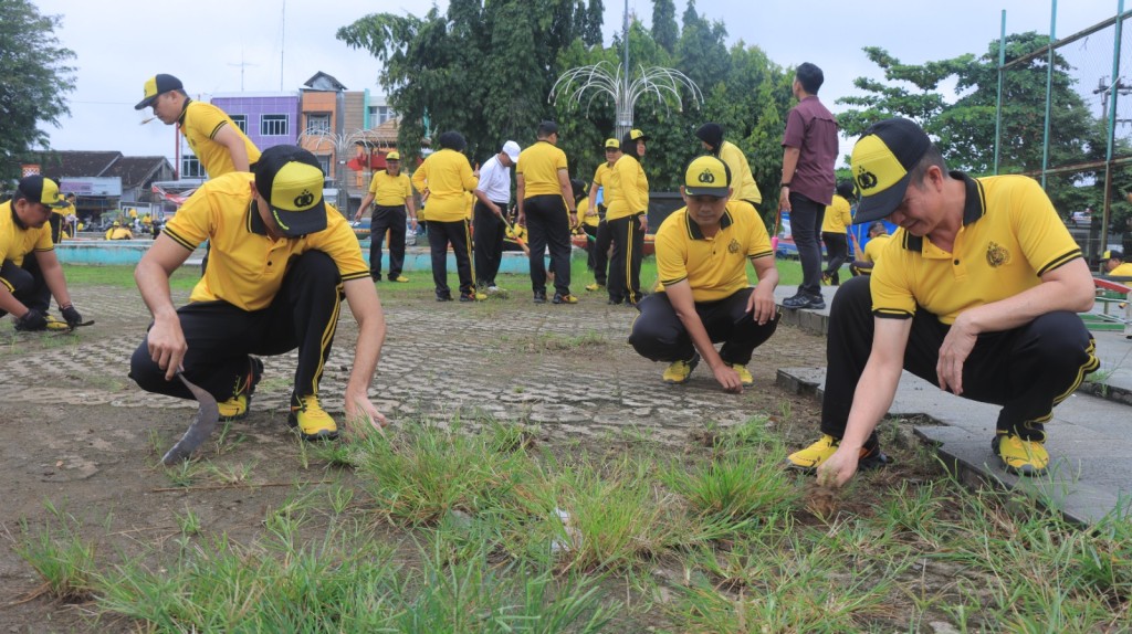 SAIBETIK- Puluhan anggota Polres Metro, bersama Forkopimda dan masyarakat, melakukan aksi bersih-bersih sampah di Lapangan Samber, Kota Metro, Jumat (6/2/2026). Kegiatan ini dipimpin langsung Kapolres Metro AKBP Hangga Utama Darmawan sebagai wujud kepedulian polisi terhadap lingkungan dan fasilitas publik.